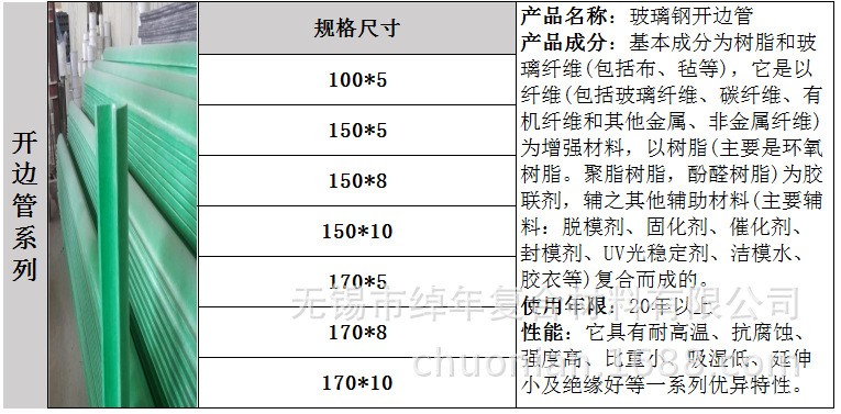 特点:玻璃钢开边管内外表面光滑,不生锈、不积垢、耐老化、耐腐蚀、施工方便,阻燃,机械强度高,适用范围广!
