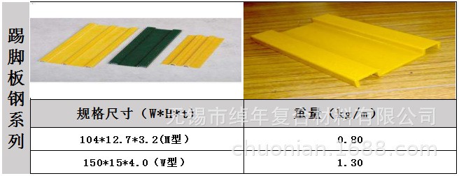 用途: 可做冷却塔下面操作平台的辅面材料,可做生化水处理池的挂具,也可作污水处理厂的检修走道,楼梯踏步等;在火车、汽车等运输业用作走道、铁路跨越轨道、货车顶部走道、平台、甲板、地沟盖板、机场照明围栏等;玻璃钢踢脚板是一种优良的结构装饰材料,我们规格齐全、质量可靠、服务周到、欢迎新老客户来电来函洽谈。